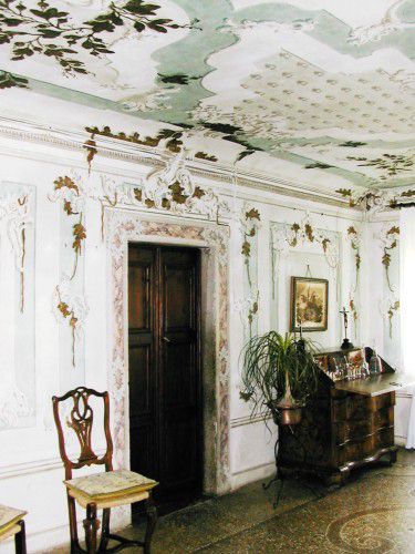 - Descrizione: L'atrio, che si sviluppa in verticale fino a comprendere anche il secondo livello delledificio, è interamente rivestito da una decorazione che crea una rete di specchiature, cornici, addobbi e fregi variamente sagomati, con pilastri antropomorfi, teste, mascheroni e vasi in maiolica con ornamenti in azzurro. Più sobria la decorazione a finti stucchi di una sala al piano terra, a sud: le porte sono contornate da una cornice in finto marmo variegato rosaceo, le riquadrature rettangolari sulle pareti presentano fregi rocaille disposti a ornamento degli angoli e delle cimase, guarnite di sottili ramaggi monocromi. Il soffitto piano è spartito in larghe cornici sagomate con tralci vegetali.