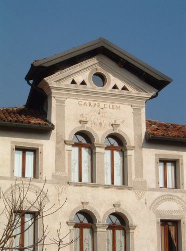 - Descrizione: Una preziosa decorazione parietale monocromatica a graffito copre tutta la facciata con motivi architettonici (stipiti, architravi,lesene, mensole, peducci).