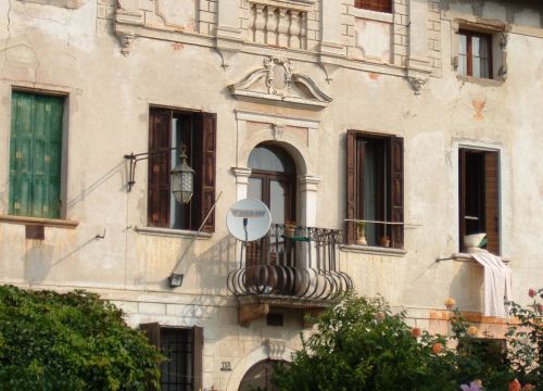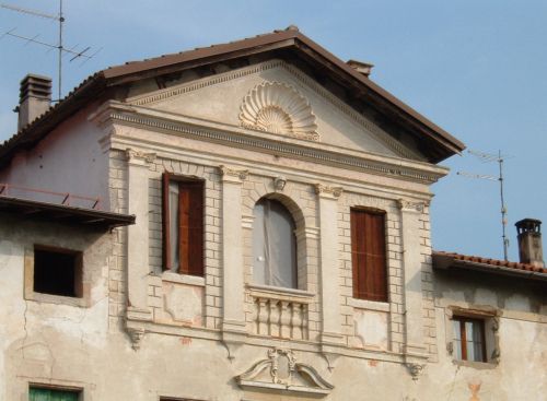 - Descrizione: Il timpano conserva un elegante motivo a conchiglia in stucco; sempre di stucco sono tre testine scolpite che fanno parte della decorazione della trifora superiore, una in chiave di volta della finestra centrale, le altre due sui peducci di due lesene. Infine un'altra decorazione in stucco si trova nel timpano spezzato della finestra al piano nobile e raffigura un'insegna gentilizia.