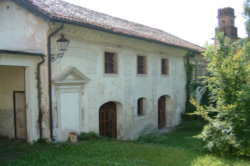 - Descrizione: Il fronte ovest delle scuderie conserva una decorazione a motivi architettonici, con portale timpanato e muratura a finte bugne.