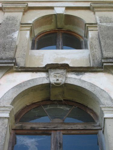 - Descrizione: Sulla chiave di volta dell'ampio barcone arcuato del piano nobile della facciata principale è scolpita una testa dalle forme molto stilizzate.