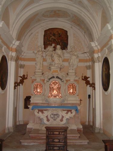 - Descrizione: Tre statue del bassanese Torretti si ergono nell'oratorio sul movimentato fastigio dell'altare marmoreo, realizzato dal veneziano B.Tabacco.
