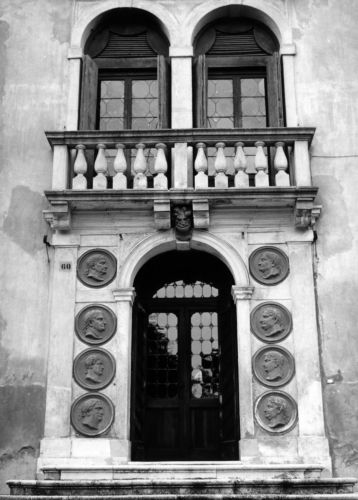 - Osservazioni: Corpo centrale affiancato da torrette, elevato su tre piani, ripartito in cinque assi verticali delle semplici finestre che, in corrispondenza del centro, sono sostituite da bifore a tutto sesto con poggioli a colonnine, mentre l'accesso al piano terra incorpora, in una scenografica parata di profili classici entro medaglioni, il portale ad arco con mascherone in chiave. Sopra la bifora del secondo piano la cornice modanata che conclude la costruzione, si interrompe al centro per l'inserimento dello stemma araldico lapideo.Timpano e voluti, con vasi posti sulla cimasa, coronano il prospetto.