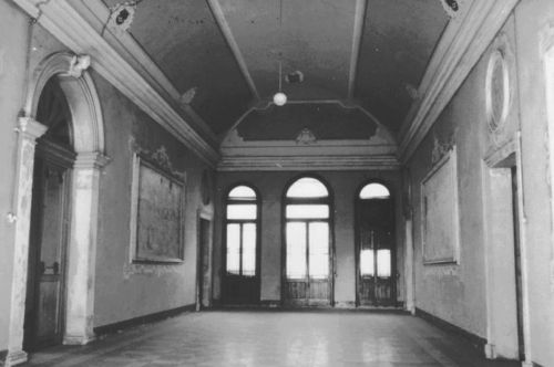 - Descrizione: Nel salone al primo piano sono affrescate le cinque sovrapporte (contornate da una cornice di stucco di forma ovale) con figure di divinità in monocromo su sfondo dorato. Una fascia ad affresco con motivi stilizzati e mascheroni circonda inoltre le quattro grandi tele settecentesche con nature morte alle pareti maggiori, ora ricoverate a Padova. Il soffitto presenta invece ornati di gusto tardo ottocentesco con stemmi, simili a quelli nella parte alta della scala (fascia con motivi vegetali e targhe in monocromo), il cui soffitto presenta un brano con coppia di genietti con ghirlande di fiori.
