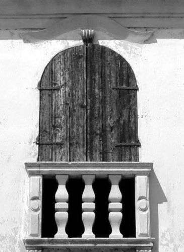 - Descrizione: La portafinestra a monofora al piano nobile ha una cornice in pietra con decoro in chiave, sormontata da una cimasa centinata.