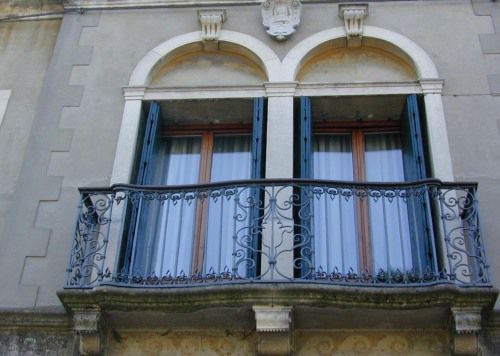 - Descrizione: La bifora, con cornice in pietra e decoro in chiave, si apre con una portafinestra su un terrazzino, sostenuto da mensole, con balaustra in ferro battuto.