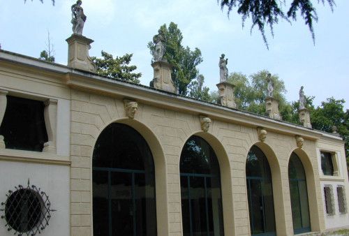 - Descrizione: Due statue decorative sono collocate sopra i pilastrini d'angolo della balaustra del terrazzino. Altre statue sono poste a decorazione sommitale dell'adiacenza porticata e lungo i viali del giardino.