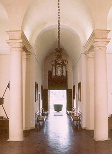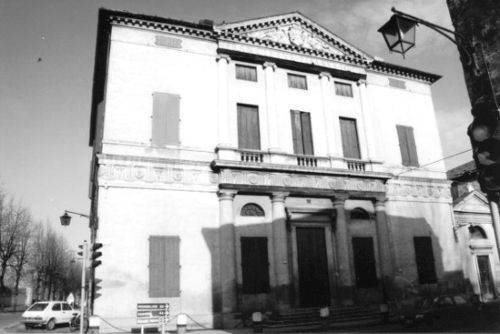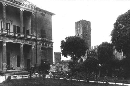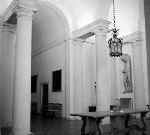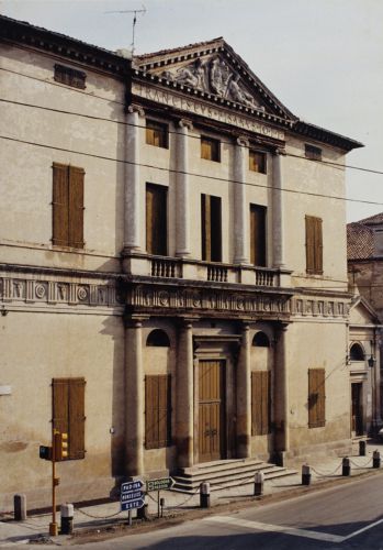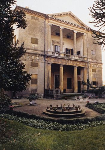 - Descrizione: Sul fronte verso il giardino il prospetto presenta, in corrispondenza della partizione mediana, un doppio loggiato di quattro colonne: a piano terra con colonne doriche, al piano nobile con colonne ioniche.