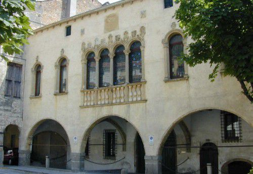 L'immobile ha pianta composta, con affaccio sulla corte posteriore; si eleva di due piani più le soffitte, con il piano terra aperto su tre fornici frontali con ampie arcate a pieno sesto su tozzi pilastri, mentre ai lati sono presenti archi a sesto acuto. Il portale di ingresso ha arco a sesto acuto. Il piano nobile si affaccia sulla corte con una preziosa quadrifora con balaustra, colonnine e archi a tutto sesto.Elementi Decorativi: