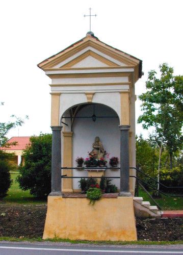 - Osservazioni: L'edicola votiva, aperta su tre lati, ha colonnine che sorreggono archi a sesto ribassato, con decoro in chiave, sormontati da una copertura timpanata.