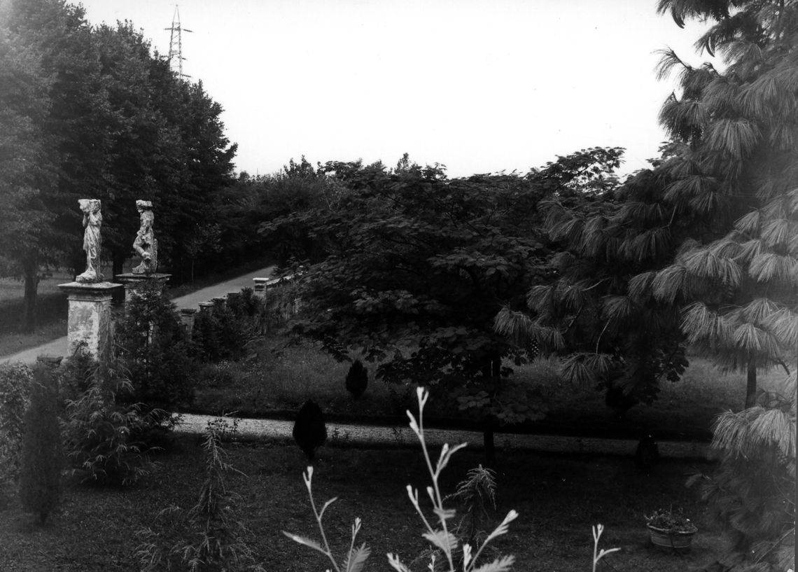 - Descrizione: Sui pilastri del cancello in asse con la villa due grandi statue in pietra: a sinistra Ercole, a destra Sisifo.