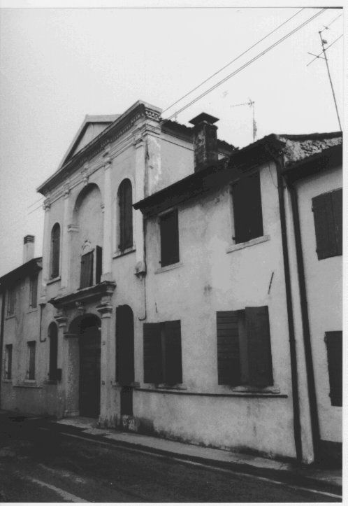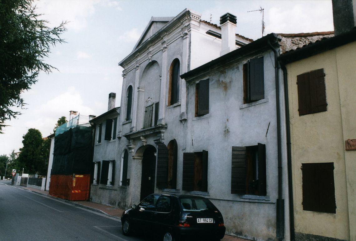 - Descrizione: La porzione mediana del prospetto è scandita, al primo piano, da quattro lesene che racchiudono aperture centinate, quella centrale oggi murata.