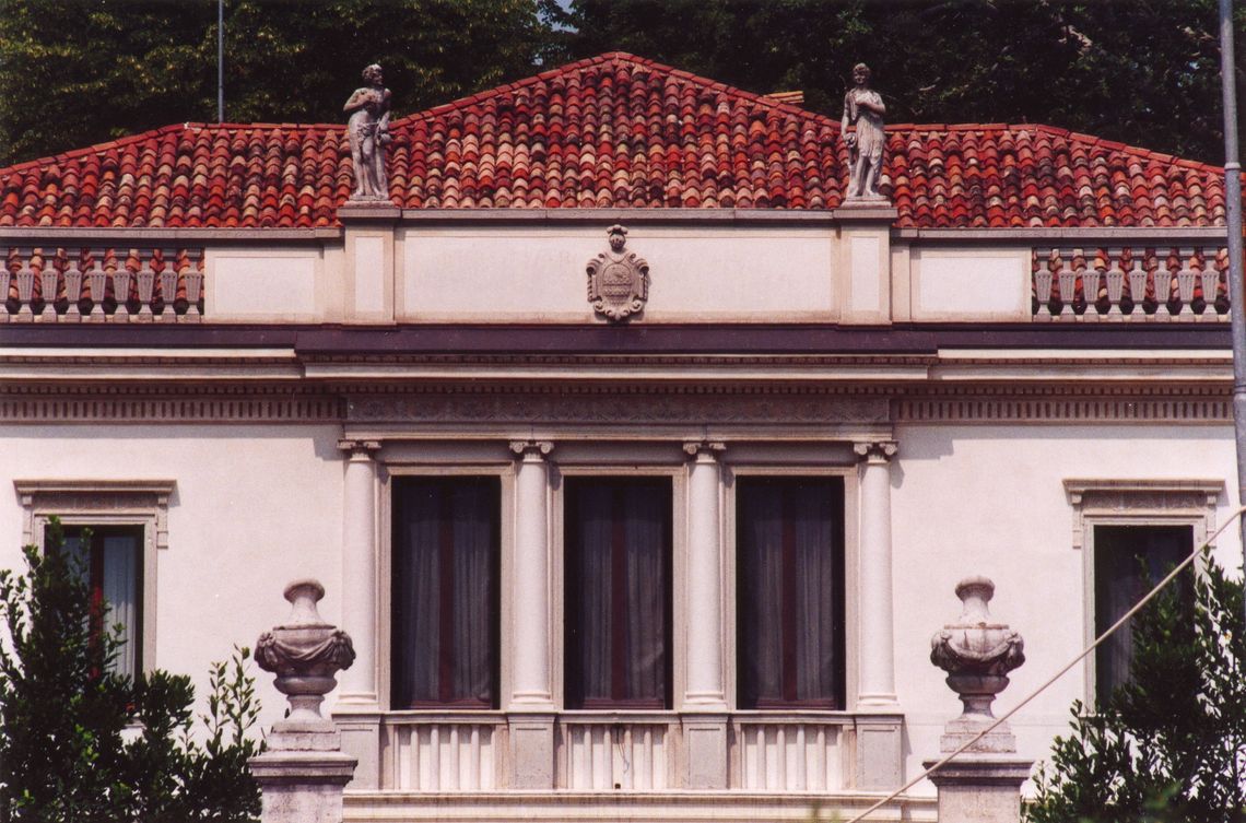 - Descrizione: La porzione mediana del prospetto è sapientemente rilevata sul filo della facciata in modo che sui pilastri della balaustra, annegata nella muratura, si impostino le semicolonne ioniche delle tre finestre.