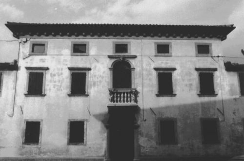 - Descrizione: Un elegante poggiolo dallo sbalzo in pietra retto da mensole modanate chiude la monofora centrale del primo piano con una balaustra composta da elementi a doppia anfora tra due colonnine a forma di putto.