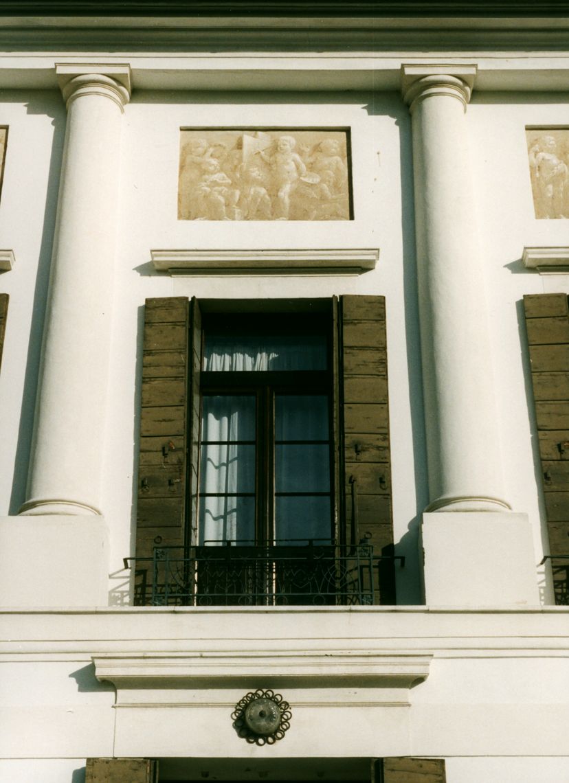 - Descrizione: Tra le quattro semicolonne, sopra le finestre del piano nobile, sono presenti delle specchiature affrescate con scene che esaltano le arti della pittura, della scultura e dell'architettura.