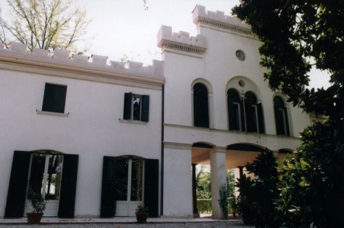 - Descrizione: Merlatura stilizzata sul corpo a nord e sul corpo centrale concluso da un elevato frontone scalettato con cornice a dentelli e merlatura finale.