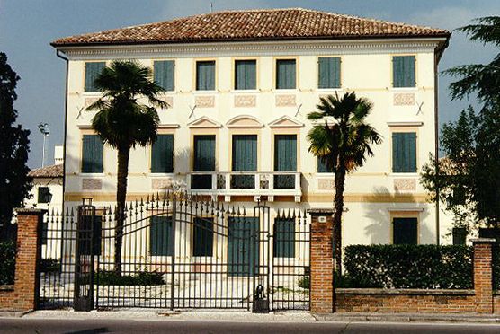 - Descrizione: Sul prospetto principale, tra le finestre del primo piano e del sottotetto, sono presenti delle specchiature con cornice bianca ed interno dipinto con motivi decorativi e festoni.