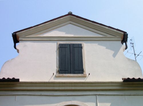 Villa affiancata da altra gemella. A pianta quadrata su due piani con grande abbaino centrale, sopraelevato di un piano, concluso da timpano triangolare affiancato da volute.Specifiche: