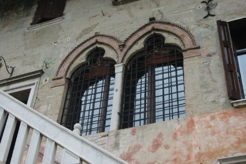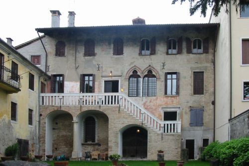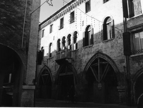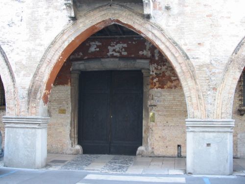 Palazzo su tre piani, con portico su strada formato da tre arcate a sesto acuto. Quadrifora rinascimentale a piano primo con poggiolo lapideo balaustrato. Bifora trilobata in facciata interna a piano nobile. Scala esterna con balaustra lapidea per accesso al piano nobile, nel cortile interno.Specifiche: