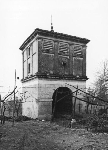 - Descrizione: Quattro lesene equidistanti scandiscono i prospetti della colombara; esse poggiano su una cornice modanata che conclude il primo livello dell'edificio, rifinito a bugnato.
