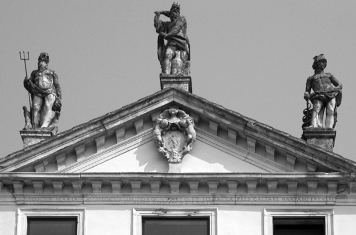 - Descrizione: Staue acroteriali che rappresentano "Giove", "Nettuno" e "Mercurio" ornano il frontone della villa assieme ai comignoli di forma piramidale.