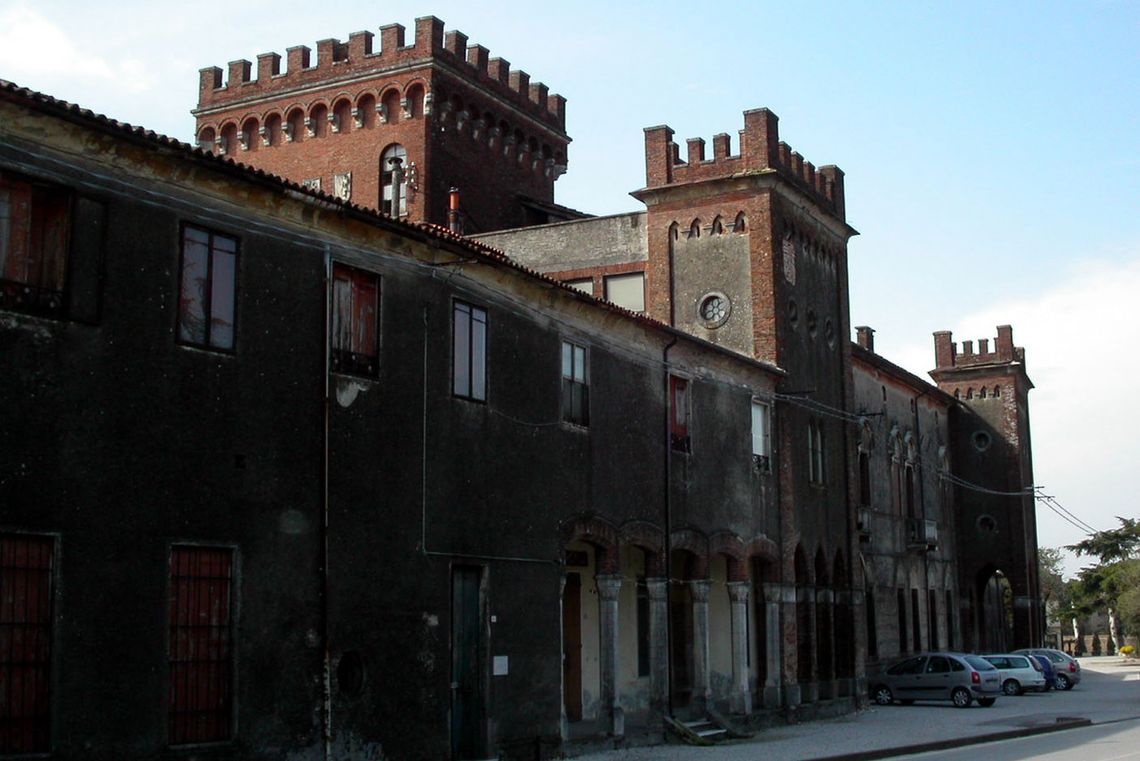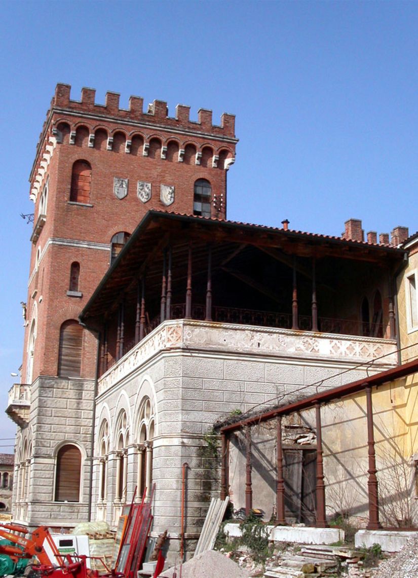 - Osservazioni: All'esterno non rimane traccia dell'originario edificio di epoca gotica. Il corpo principale verso la strada è individuato da due torrioni in stile neogotico, come le finestre ad arco che illuminano i primi due piani dell'edificio.