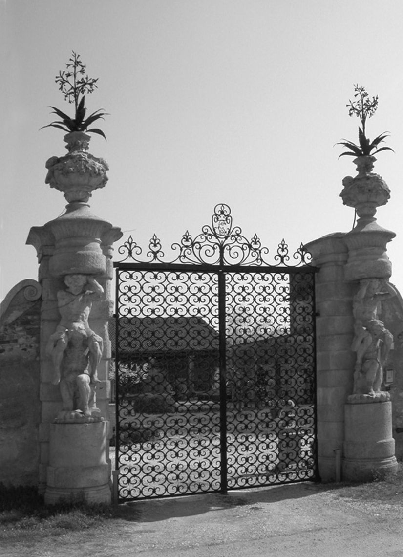 - Descrizione: Cancellata d'ingresso: coppie di telamoni su alto piedistallo sono incastonati nei pilastri a fasce alterne: il primo regge sulle spalle il secondo, che regge un elemento tondeggiante sormontato da un vaso di fiori in ferro battuto. Opera attribuita dallo studioso Cevese a Gianmaria Comun di Grancona.