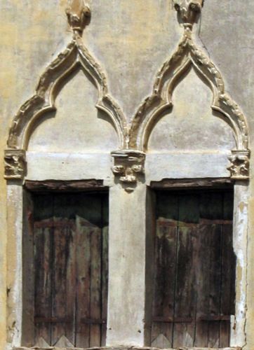 - Descrizione: Una bifora con due cornici ad arco polilobate si apre in facciata, al di sopra dell'ingresso.