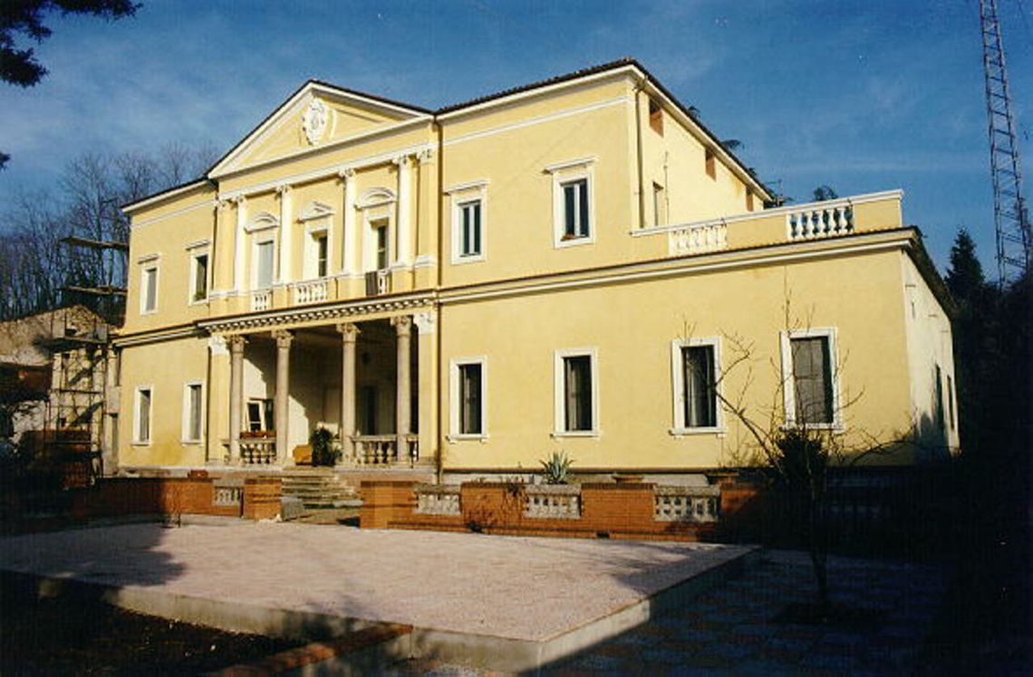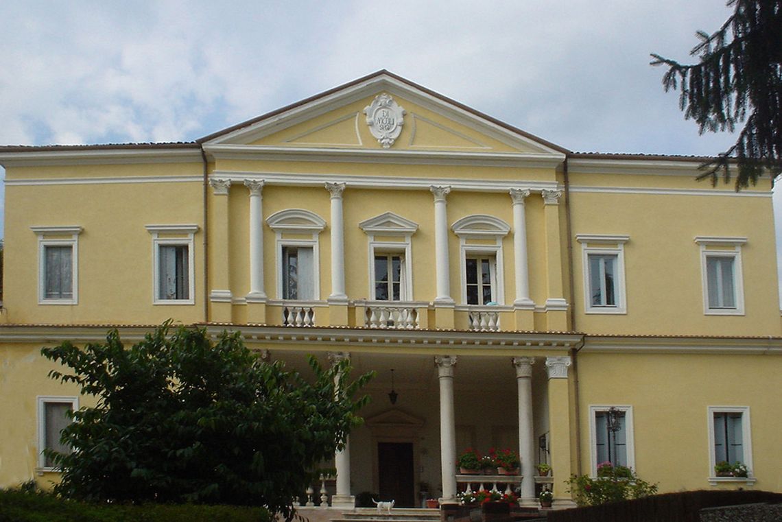 Edificio isolato, ubicato ai limiti dell'abitato e all'interno di un giardino, a cui si accede da cancellata tra pilastri sormontati da statue.Specifiche: