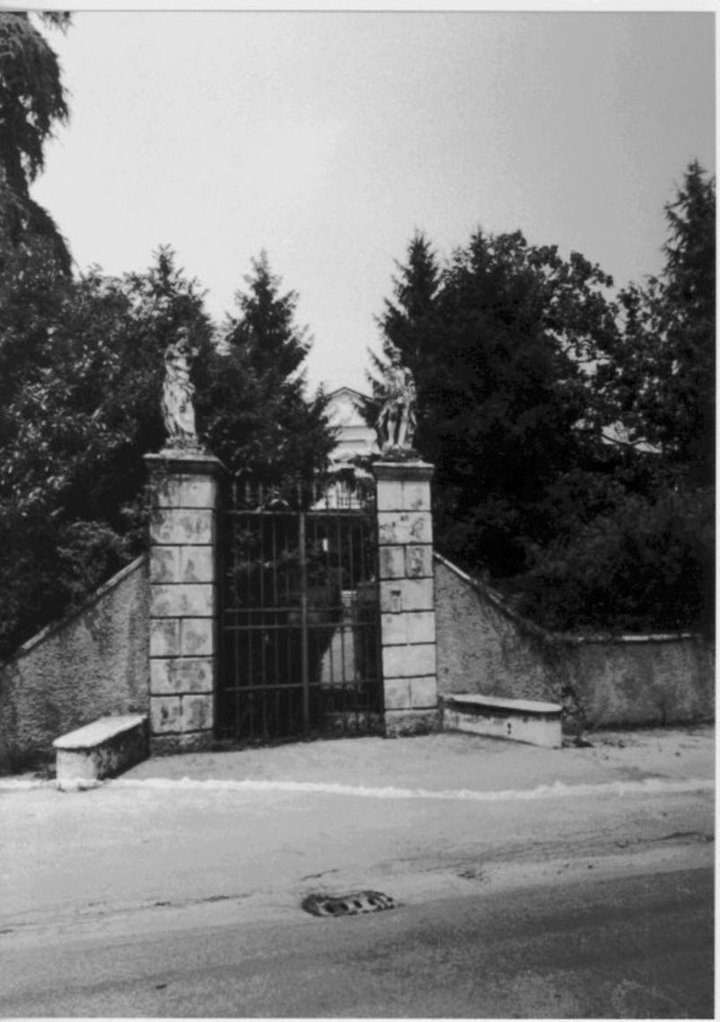 - Descrizione: Le statue che decorano la cancellata d'ingresso alla villa potrebbero risalire al tardo Settecento, presunta epoca di costruzione dell'originario complesso.