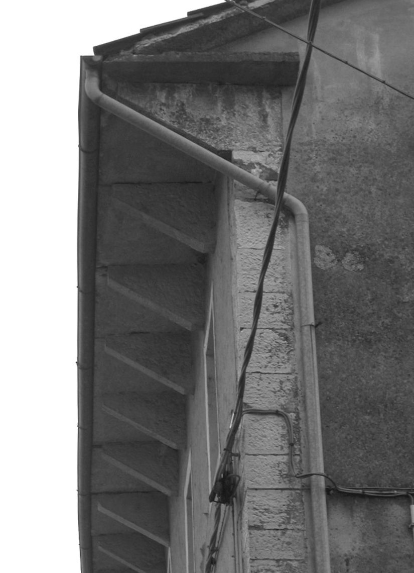 - Descrizione: Possenti mensoloni lapidei di forma triangolare reggono lo sporto del tetto; alle estremità, si appoggiano agli elementi lapidei che definiscono i cantonali dell'edificio.