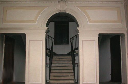 - Descrizione: Una finitura a bugnato gentile a larghe fasce, conclusa da piatta cornice marcapiano, interessa l'intero piano terra.