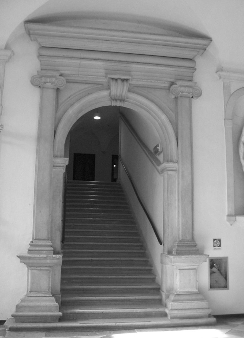- Descrizione: All'interno, scenografico scalone introdotto, al pianoterra, da ampio portale lapideo dal profilo centinato con voluminosa voluta in chiave d'arco, riquadrato da lesene su piedistalli che sorreggono trabeazione e cimasa modanata.