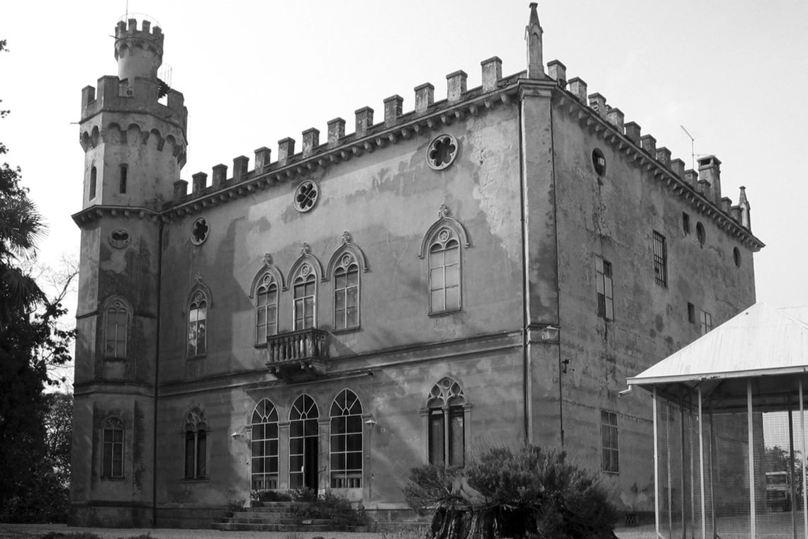 - Osservazioni: Il massiccio volume a pianta quadrangolare è caratterizzato da un'alta torretta ottagonale sul lato occidentale. Il fronte principale presenta finestre archiacute con pennacchi al piano terra e primo, rosoni lobati nel sottotetto e una merlatura sommitale con pinnacoli agli angoli.