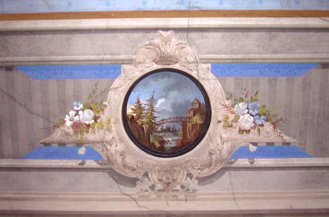 - Descrizione: Fronte ovest, sotto il balcone centrale del piano nobile, brevi brani di affresco raffiguranti elementi vegetali e putti all'interno di cornici geometriche in tonalità neutre su fondo rosso.