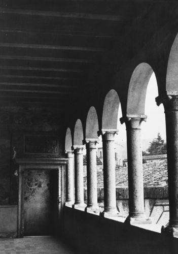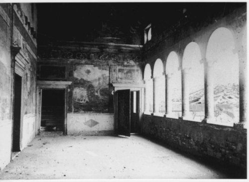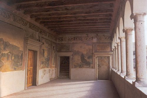 - Descrizione: In alto, la loggia è ornata da un fregio in cui sono raffigurati alcuni volti di poeti laureati e, probabilmente, di poetesse. Sul lato verso la scala d'accesso, si scorgono due scene monocrome, raffiguranti gli episodi di "Muzio Scevola", che brucia la mano destra davanti a Porsenna e di "Decio Mure", pronto a lanciarsi in un dirupo per propiziare l'esito della battaglia; in basso, invece, si trovano alcuni riquadri con le seguenti 'storie': "Conversione di sant'Agostino", "Aruspici che scrutano il volo degli uccelli" e la "Caduta di un fulmine".