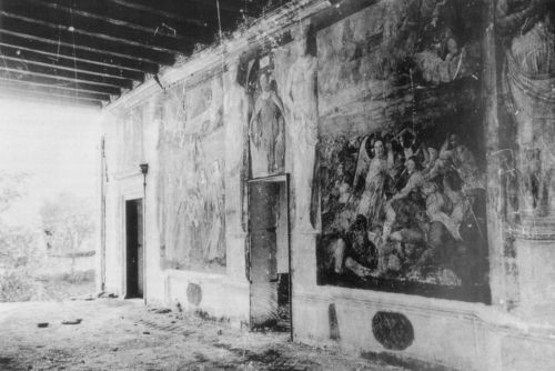 - Descrizione: Le pitture del salone raffigurano alcuni episodi ispirati all' "Apocalisse". A partire dalla parete orientale: l"Elezione dei giusti" e "Il flagello della Cavalleria". Nella parete occidentale: "Sette coppe dell'ira divina" e l'"Assedio di Gerusalemme" (in cui è svolto anche l'episodio della "Caduta di Satana"). A separare le scene intervengono coppie di cariatidi e telamoni a monocromo, mentre completano la decorazione otto "Sibille".