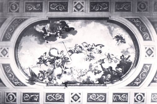- Descrizione: I soffitti dei corridoi erano decorati con due trofei di armi alle estremità entro finti cassettoni a sfondo azzurro e rosso, ornati con girali fitomorfi.
