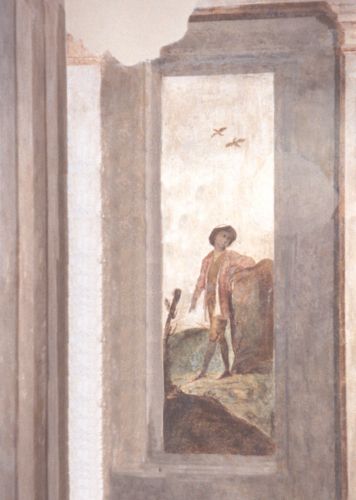 - Descrizione: Sotto l'intonaco è apparsa una parte di decorazione costituita da una fascia a finto marmo mischio. Nella sezione superiore è dipinto un tondo al cui interno si nota una figura intenta a fissare il Crocifisso.
