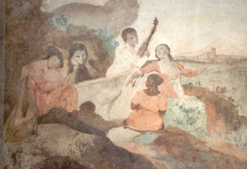 - Descrizione: La fascia più alta dell'ambiente è decorata da un fregio a monocromo dorato, con motivo a fogliette; nella sezione inferiore, architetture dipinte, ornate da specchiature in finto marmo incorniciano gli elementi figurativi. Nei lati brevi, si trovano quattro busti monocromi, raffiguranti due "Imperatori" e due "Imperatrici". In qualche caso è percepibile la sagoma di strumenti musicali. Su ciascun lato, inoltre, nella sezione inferiore, è dipinta una finta porta al cui interno sono raffigurate rispettivamente la "Fede" e la "Carità". Al centro di ciascun lato, cornici monocrome racchiudono un paesaggio. Sui lati lunghi la decorazione si imposta essenzialmente su figure a terra rossa.