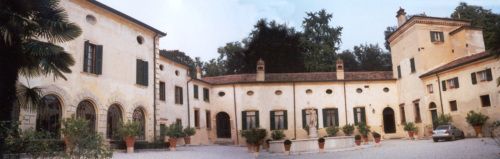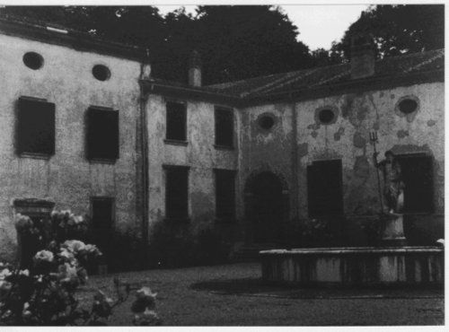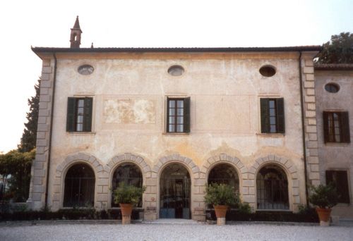 - Descrizione: Nel salone, sulle pareti maggiori, le porte sono evidenziate da alcune profilature affrescate, arricchite, nella parete verso la scala, da due putti sovrapporta e da uno stemma compreso entro unaquila bicipite, anchesso allusione allaquila estense; nella parete verso lesterno, invece, da un leone marciano. Inoltre, sempre nel salone, si trova un monumentale soffitto ligneo con dodici lacunari dipinti, nelle incorniciature, con mascheroni, festoni e altri decori. È evidente che da una parte di questi lacunari, ora vuoti, provengono le otto interessanti tele raffiguranti, uno Zodiaco in un trionfo di figure scorciate, festoni di frutta e riferimenti araldici, ora conservate nel grande salone al piano terra dellHotel Due Torri a Verona.