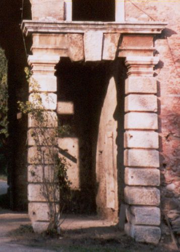 - Descrizione: Verso l'esterno il portale con ingresso ad arco centinato è inserito in prospetto a bugnato con nicchie semicircolari, mentre nell'affaccio interno è composto da una struttura a serliana con elementi decorativi come il bugnato, la chiave di volta e i pilastri.
