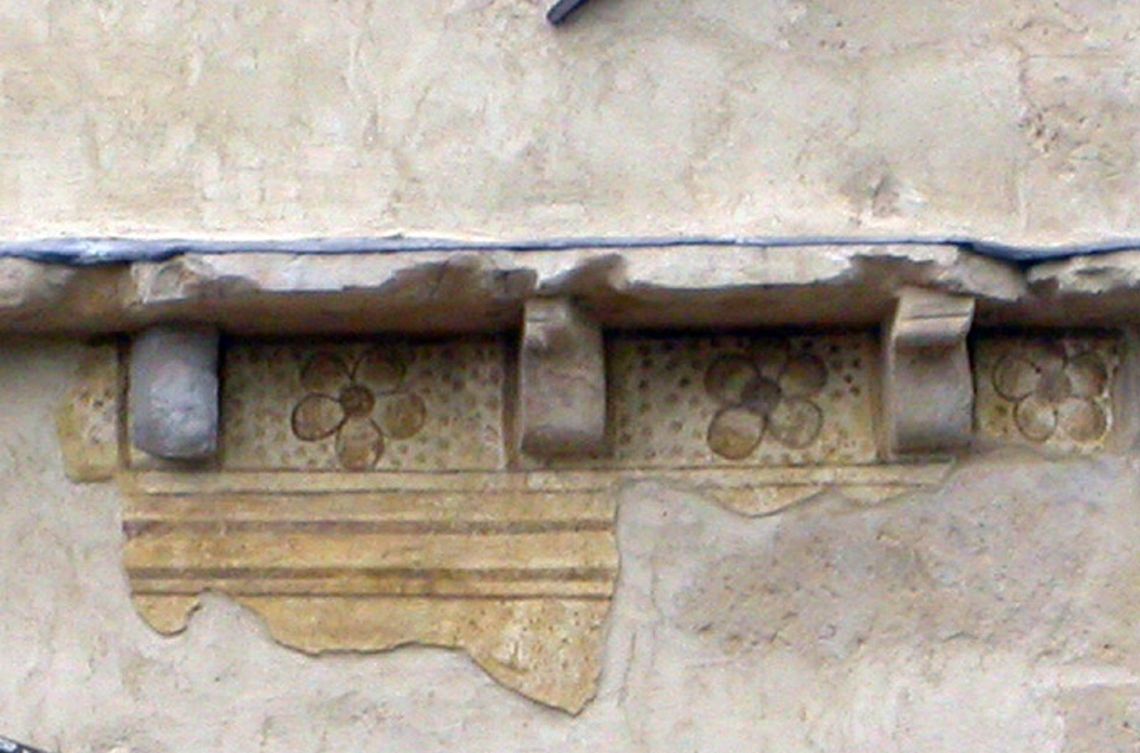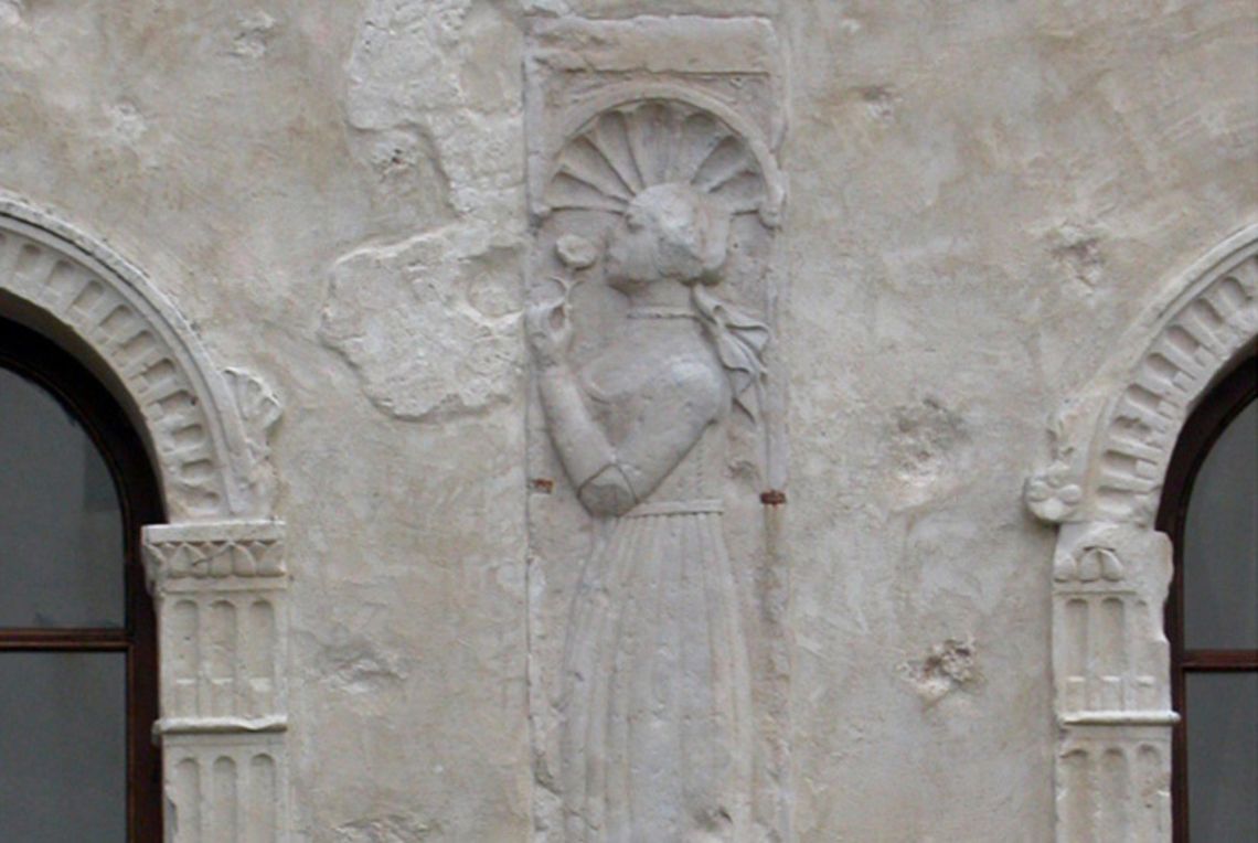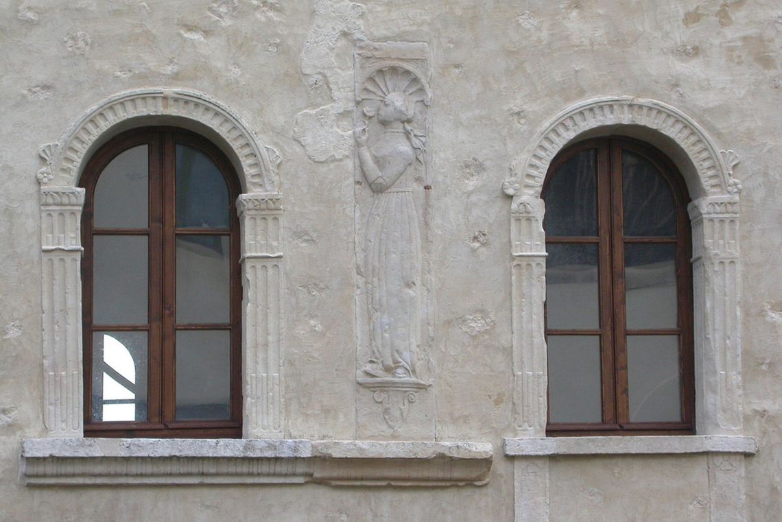 - Descrizione: La torre è decorata da un apparato scultoreo che deriva da materiale di spoglio forse da qualche cappella gentilizia di Vicenza o forse dal cantiere della chiesa di Santa Corona. La decorazione sembra legata alla cultura artistica di Lorenzo da Bologna e dei maestri di Pedemuro.