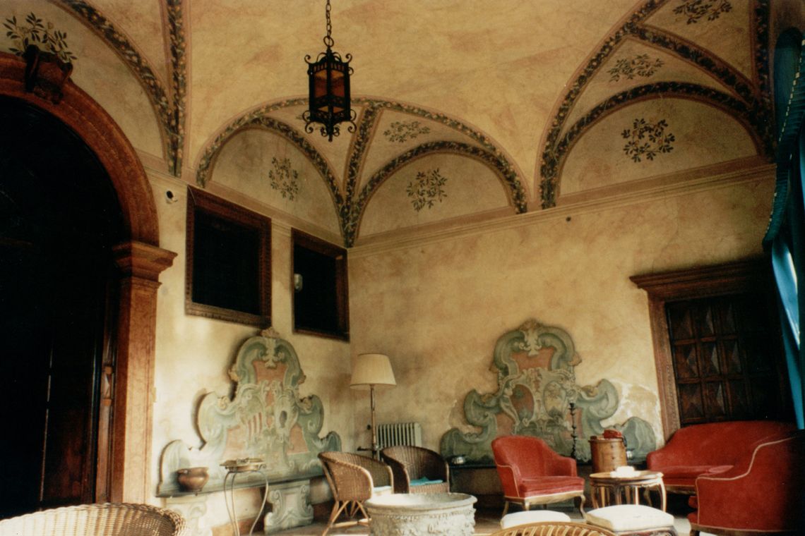 - Descrizione: Nel sottotetto si svolge il fregio in cui permangono frammentarie decorazioni a monocromo. Si scorgono ancora putti, volute floreali e una varietà di fiere, animali fantastici e mostri marini. Della fascia decorata sovrastante il loggiato, che forse in origine raffigurava divinità fluviali, non resta visibile che un frammento, con una figura virile di schiena e un personaggio barbuto con in mano lo stemma Marogna.