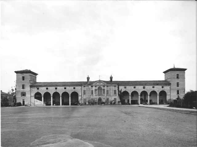 - Osservazioni: La simmetria dell'impaginato è mantenuta anche nei limiti laterali della costruzione definiti da due torri colombare di quattro piani a base quadrata e con copertura a padiglione: anche queste riprendono la decorazione a bugnato nel piano terra e la stessa tipologia di cornicione a conclusione dei prospetti.