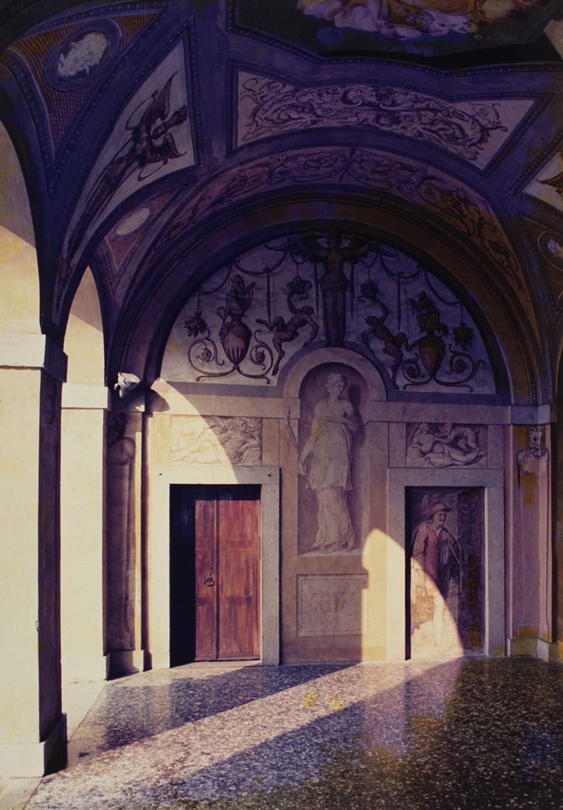 - Descrizione: Entro illusionistiche balconate sono raffigurati due "Paesaggi". Sulle pareti laterali, da due finte porte escono le figure di un "Contadino" e di una "Filatrice"; seguono tra arcate le immagini a monocromo della "Pace" con la fiaccola rivolta a terra e di una figura femminile con doppia testa e una fiaccola, di non facile identificazione. Grottesche, pure a monocromo, decorano le vele della volta, dove al centro appaiono tra le nubi "Mercurio con Flora che sparge fiori".