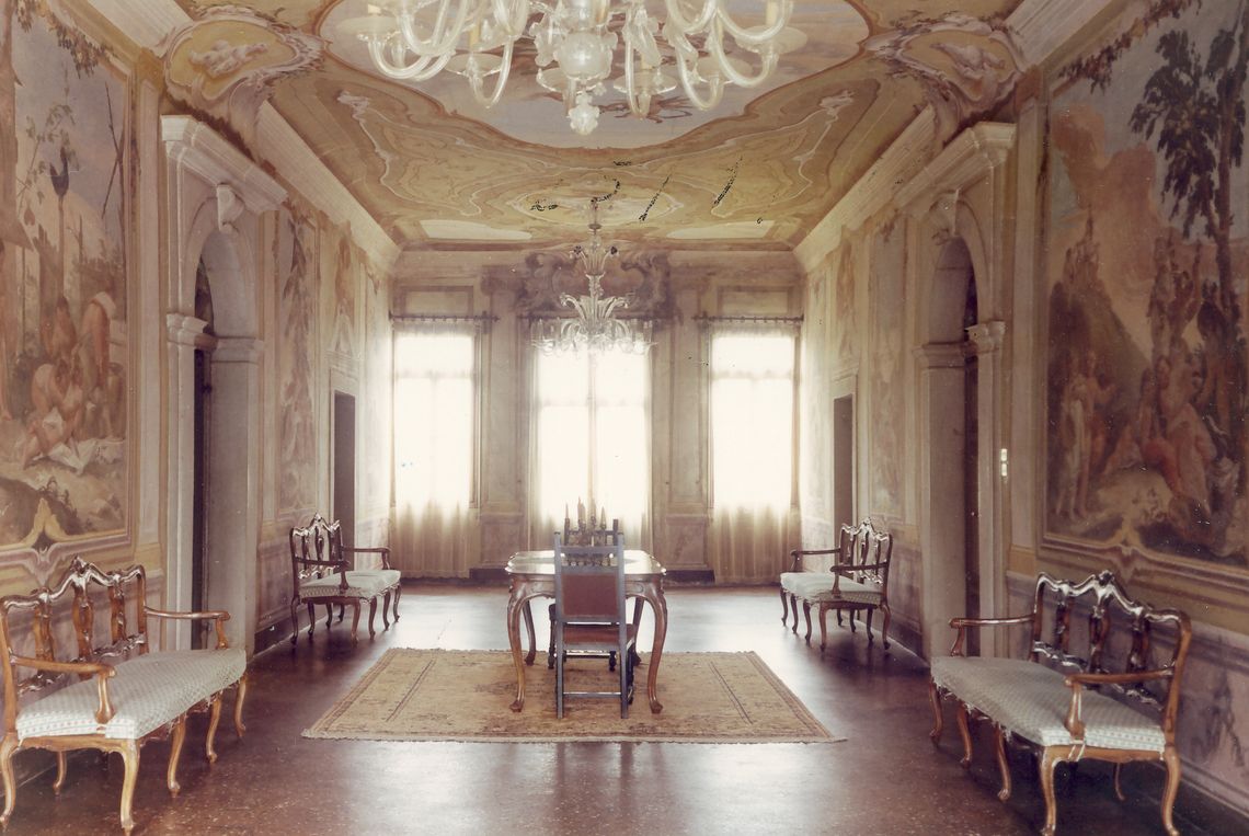 - Descrizione: Al salone nobile le pareti lunghe sono abbellite dagli affreschi settecenteschi di Costantino Cedini che raffigurano, all'interno di architetture murali dipinte, pregevoli scene di soggetto bucolico, costellate di putti e bambini.