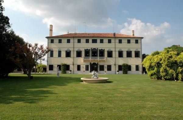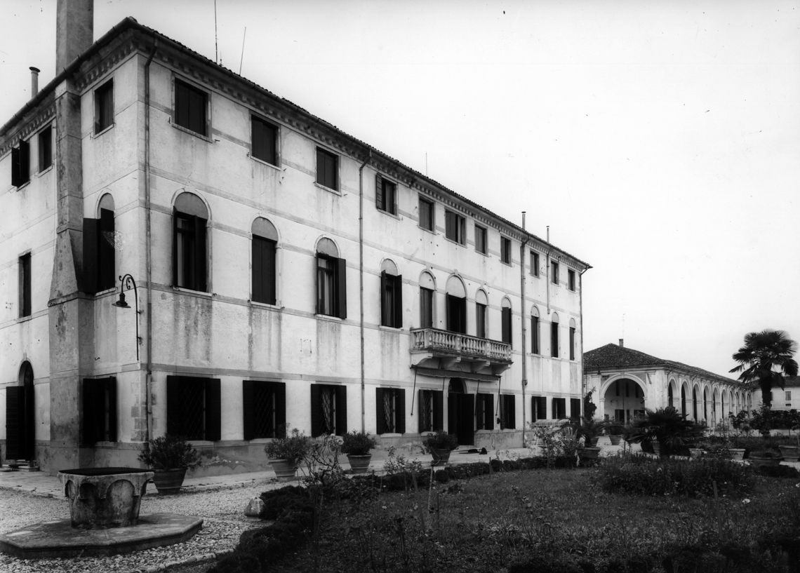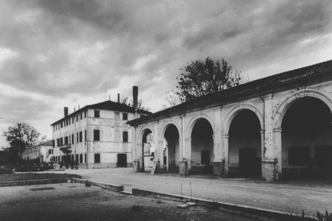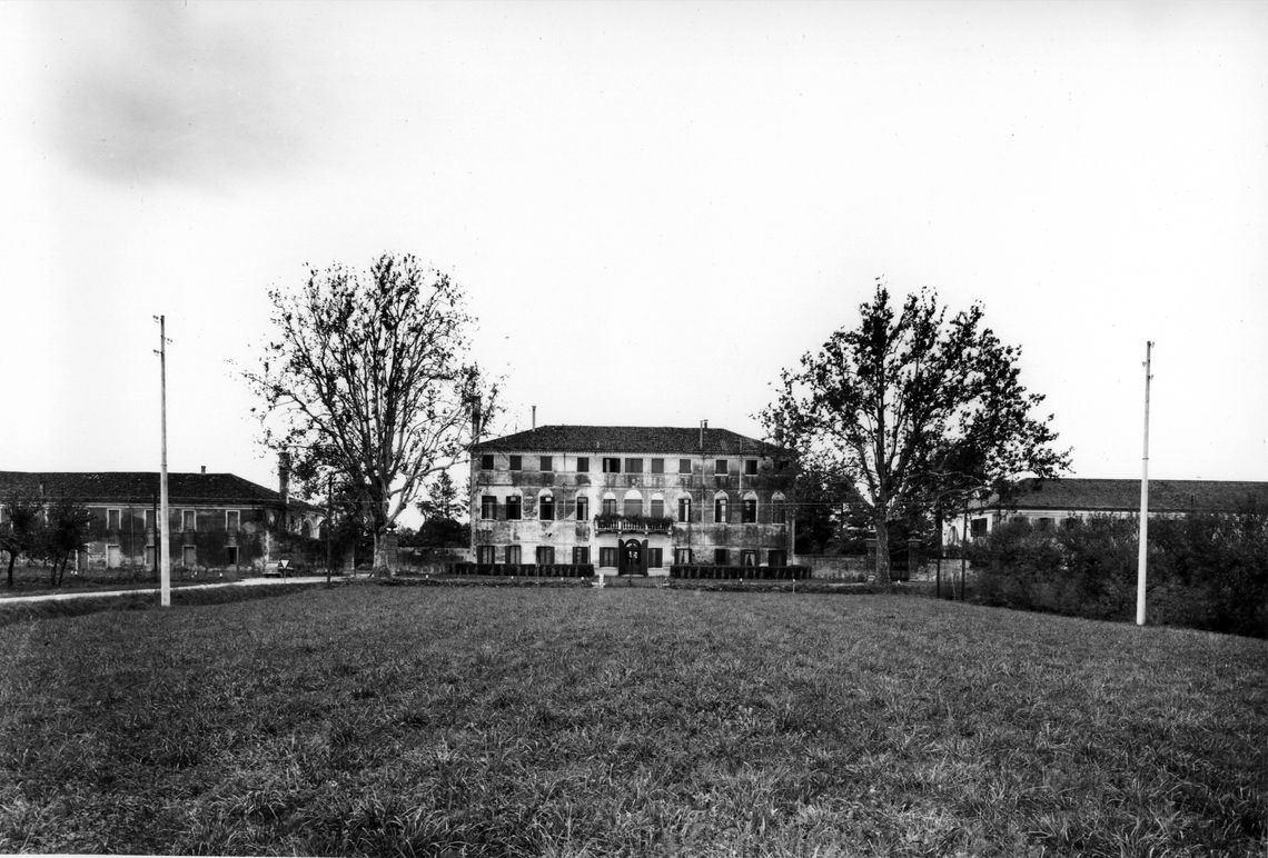 Tre corpi allineati lungo la sede stradale staccati fisicamente: corpo dominicale al centro e ai lati due barchesse simmetriche finestrate verso la strada e porticate verso la campagna.Specifiche: