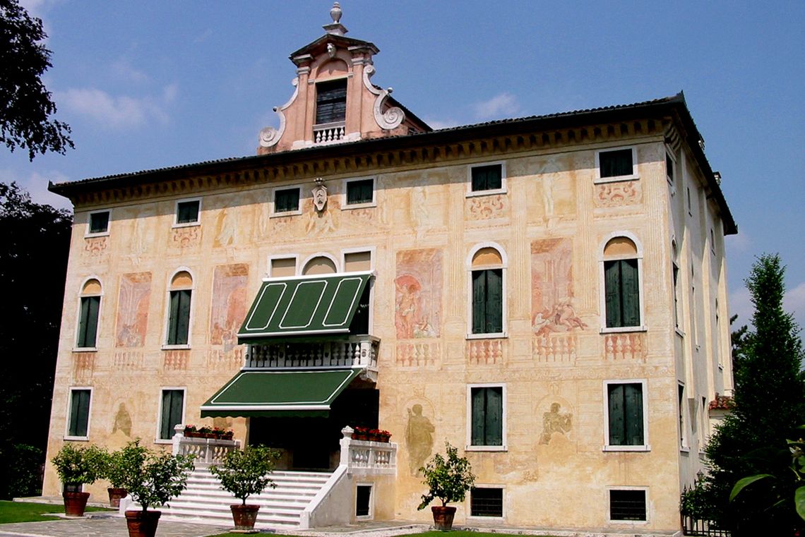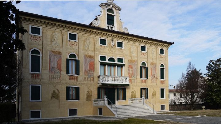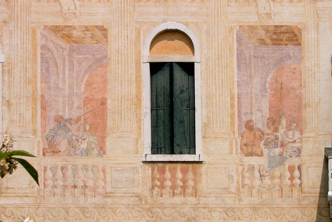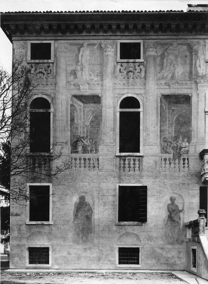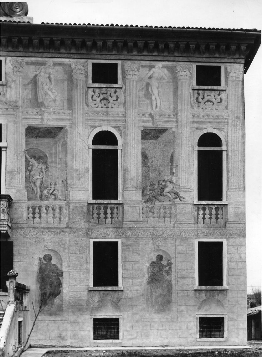 - Descrizione: La decorazione ad affresco è imperniata attorno al centrale poggiolo con serliana che domina la scalinata d'accesso. Si parte dal piano seminterrato, dove tracce di un finto bugnato si articolano tra le aperture spingendosi sino al primo piano, che presenta quattro nicchie fittizie, arricchite da finte statue bronzee avvicinabili alle Virtù civili. I due piani successivi confermano l'impiego del medesimo artificio narrativo, in cui spiccano , però, illusionistiche infilate prospettiche ove si affacciano svariate figure.
