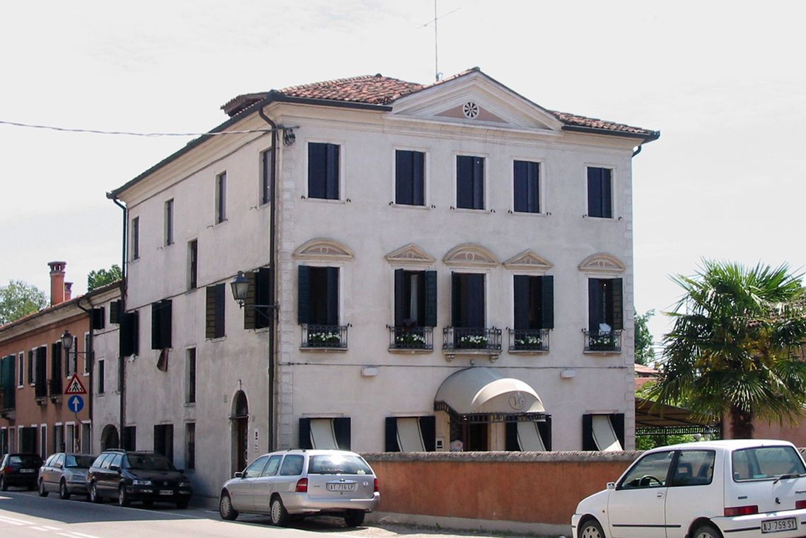 L'edificio si sviluppa su tre piani e cinque assi e presenta delle aperture tutte rettangolari munite di balconcino al piano nobile. Il prospetto è concluso da un piccolo frontone triangolare modanato con oculo.Specifiche: